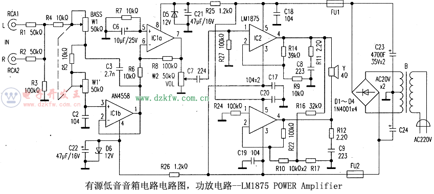 有源低音音箱電路,功放電路--LM1875 POWER Amplifier