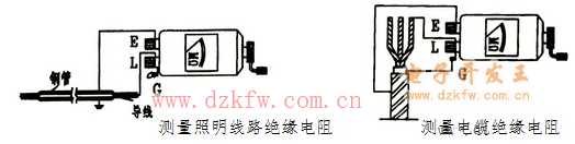 搖表(兆歐表)有三個測量端鈕,一個線路端鈕(L),另一個是接地端鈕(E),還有一個為屏蔽端鈕(G)。一般測量照片或電力線路對地的絕緣電阻時(shí),只用L和E端,接線如下左圖所示。“L”端接到被測設(shè)備的“火”或“相端”,“E”端接到被測設(shè)備的“地”端。在測量電纜對地絕緣電阻時(shí)或被測設(shè)備的漏電流嚴(yán)重時(shí),使用“G”端鈕。如下右圖所示為測量電纜絕緣電阻接線圖。