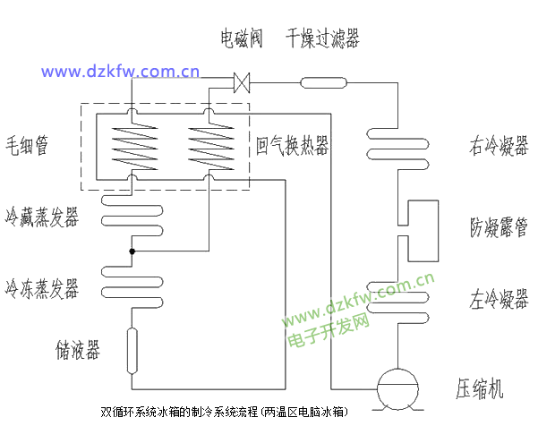 2、雙循環系統冰箱的制冷系統流程(兩溫區電腦冰箱)