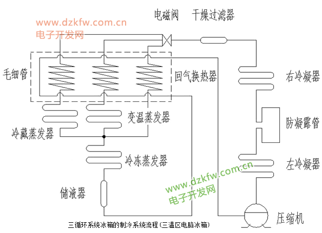 3、三循環系統冰箱的制冷系統流程(三溫區電腦冰箱)