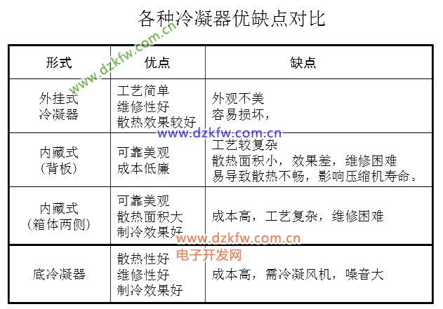 冷凝器包括側冷凝器、背冷凝器、底冷凝器等,除露管也是冷凝器的一種,但其主要作用是防止冰箱門封處的凝露。
