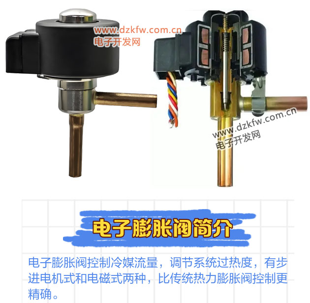 電子膨脹閥:電子膨脹閥的應(yīng)用克服了熱力膨脹閥的缺點(diǎn),并為制冷裝置的智能化提供了條件。主要是利用調(diào)節(jié)參數(shù)產(chǎn)生的電信號(hào),控制施加于膨脹閥上的電壓或電流,從而達(dá)到調(diào)節(jié)目的,到是電子膨脹閥控制系統(tǒng)復(fù)雜,價(jià)格較高。