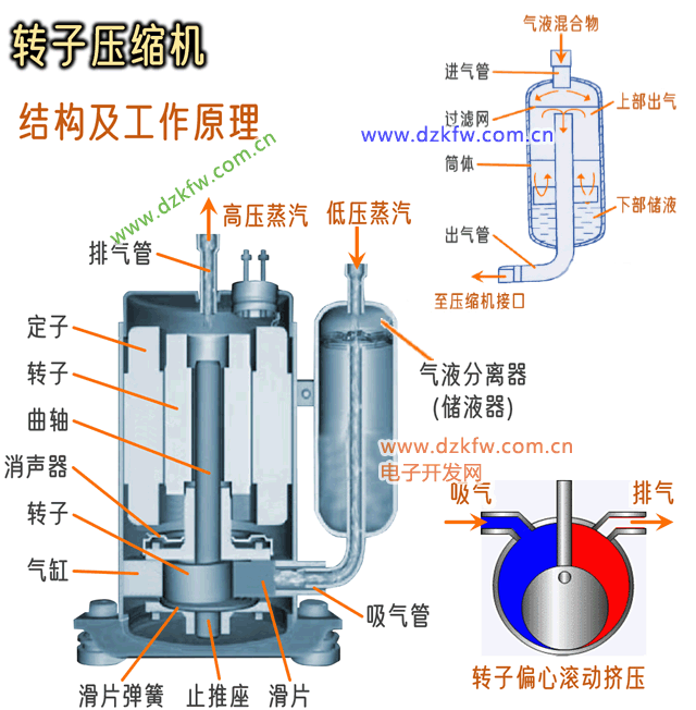 轉(zhuǎn)子式壓縮機(jī):由帶偏心輪的主軸、氣缸、套筒、進(jìn)氣口、滑板、彈簧、排氣閥、排氣口組成。