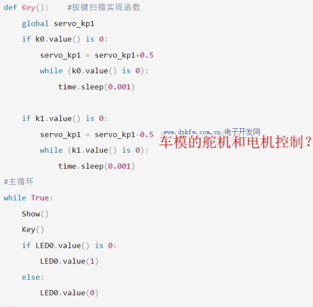 這里以無線電軌智能車綜合測試程序為例, 來說明一下 MicroPython 程序的特點。對于初學者來看, 這個程序顯得有點復雜,但在整體上, 大家看到, 它分為前后兩部分。 前面部分屬于 Setup 初始化部分, 做了很多的硬件初始化, 也定義了一些函數(shù)。后面一部分,就是有 while 形成的 循環(huán)控制部分, 這些屬于軟件的后臺任務部分。在每一次循環(huán)中依次執(zhí)行 OLED 屏幕的刷新,按鍵的檢測處理,以及控制板上 LED 的閃爍, 用于顯示程序運行狀態(tài)。此時估計大家會有一個疑問, 車模運動中舵機和電機控制代碼在哪里執(zhí)行呢?